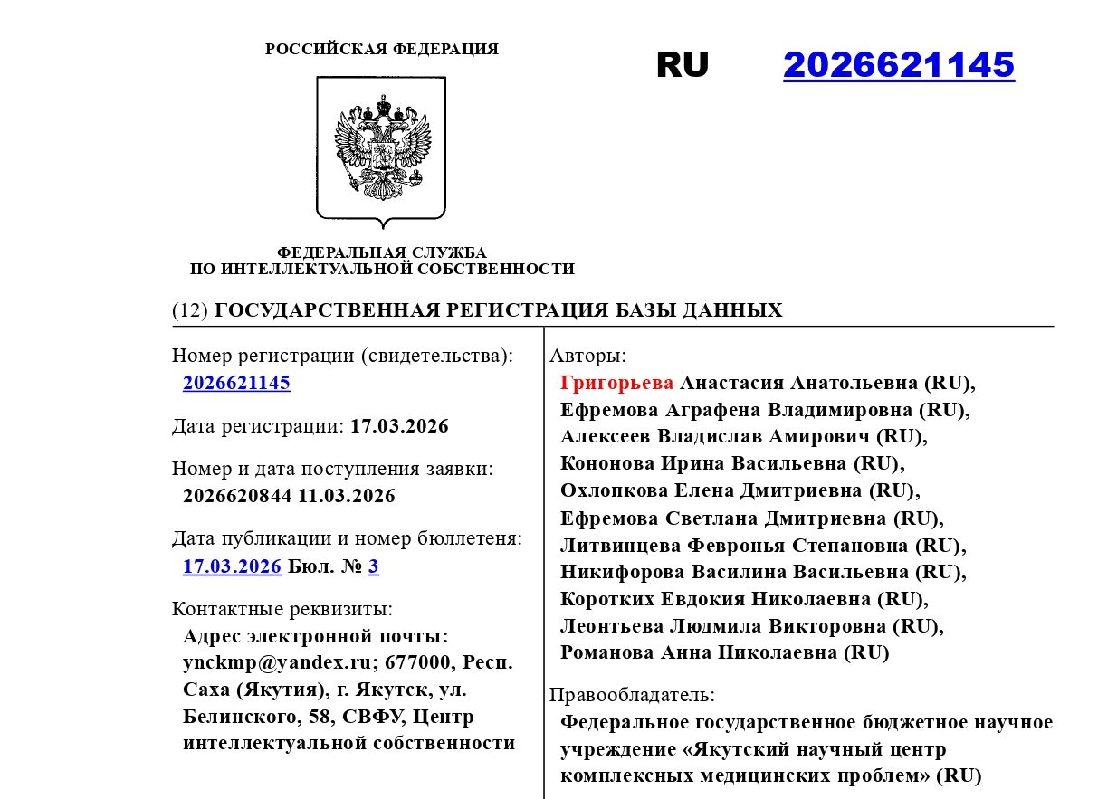Получено свидетельство о государственной регистрации новой базы данных «Показатели мелатонина, антропометрических данных с биоимпедансным анализом, биохимического и общего анализа крови, сывороточного железа и калия у женщин, проходивших лечение в ревматологическом отделении Клиники ЯНЦ КМП в 2024 году» (№ 2026621145, дата регистрации: 17.03.2026, дата публикации и номер бюллетеня: 17.03.2026, Бюл. № 3).