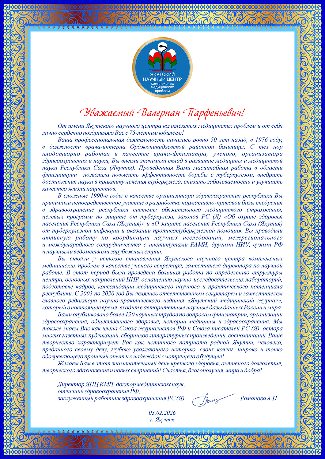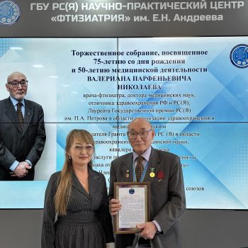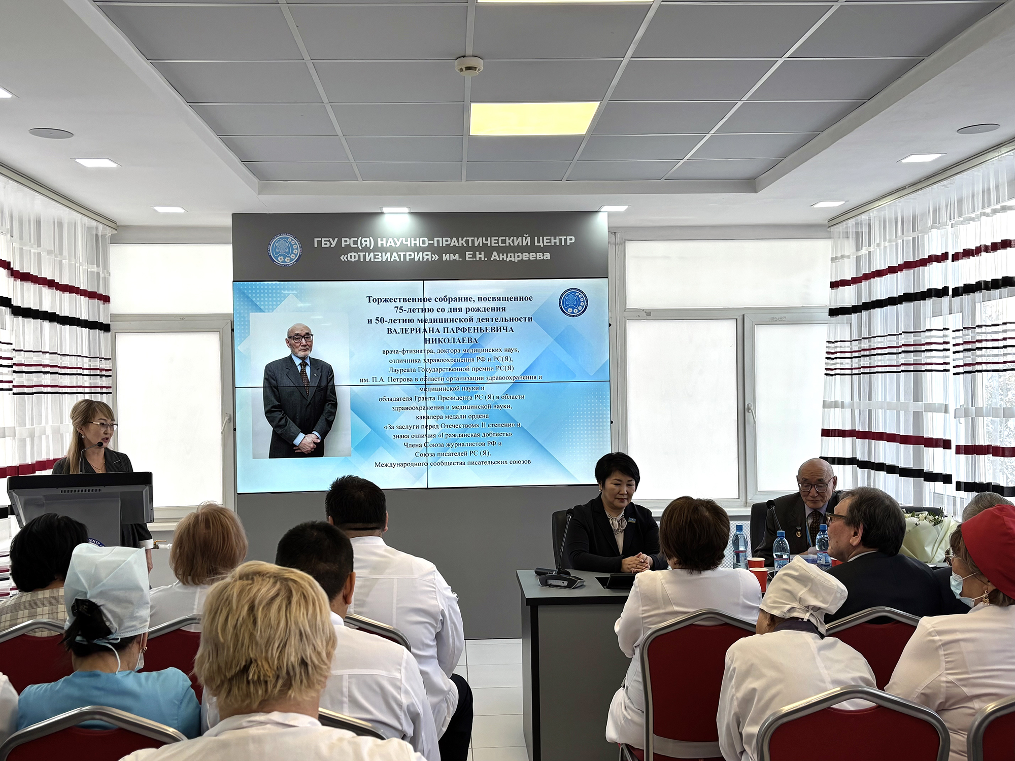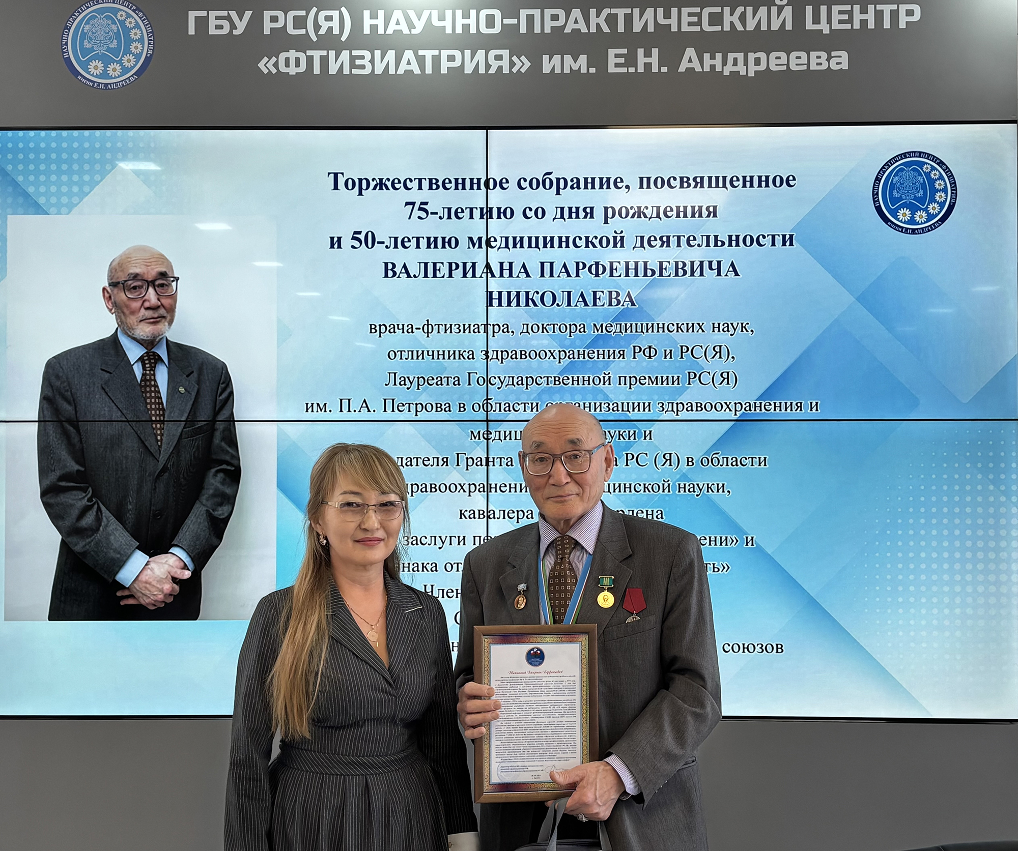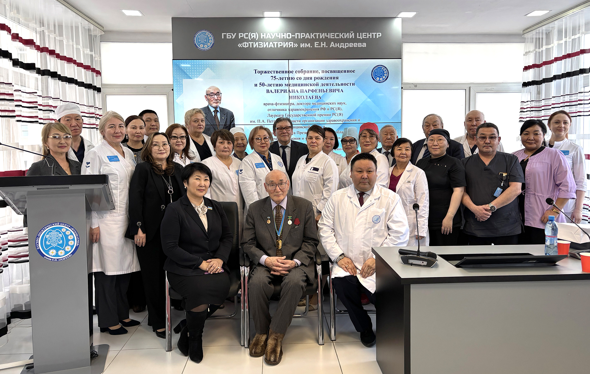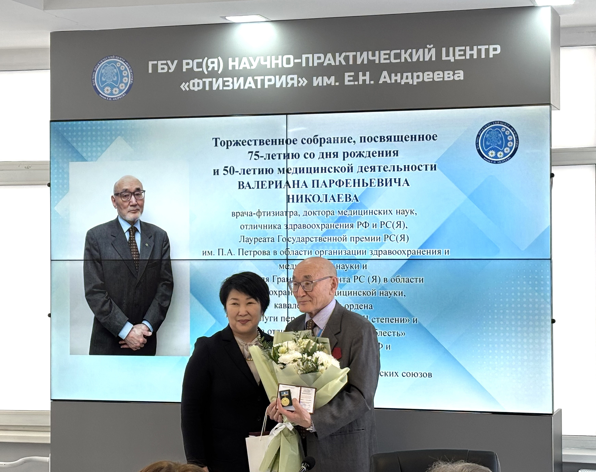 6 февраля 2026 года в конференц-зале НПЦ «Фтизиатрия» прошло торжественное собрание, посвященное 75-летию со дня рождения и 50-летию медицинской деятельности доктора медицинских наук Николаева Валериана Парфеньевича. На открытии собрания ученый секретарь НПЦ к.м.н. Е.С. Павлова представила презентацию о врачебной и научной деятельности юбиляра, осветила его основные научные труды. Далее с поздравительной речью выступила министр здравоохранения Республики Саха (Якутия) Л.Н. Афанасьева, которая отметила высокие заслуги Валериана Парфеньевича в развитии фтизиатрии, организации здравоохранения республики и вручила нагрудный знак «Почётный ветеран здравоохранения Республики Саха (Якутия)».