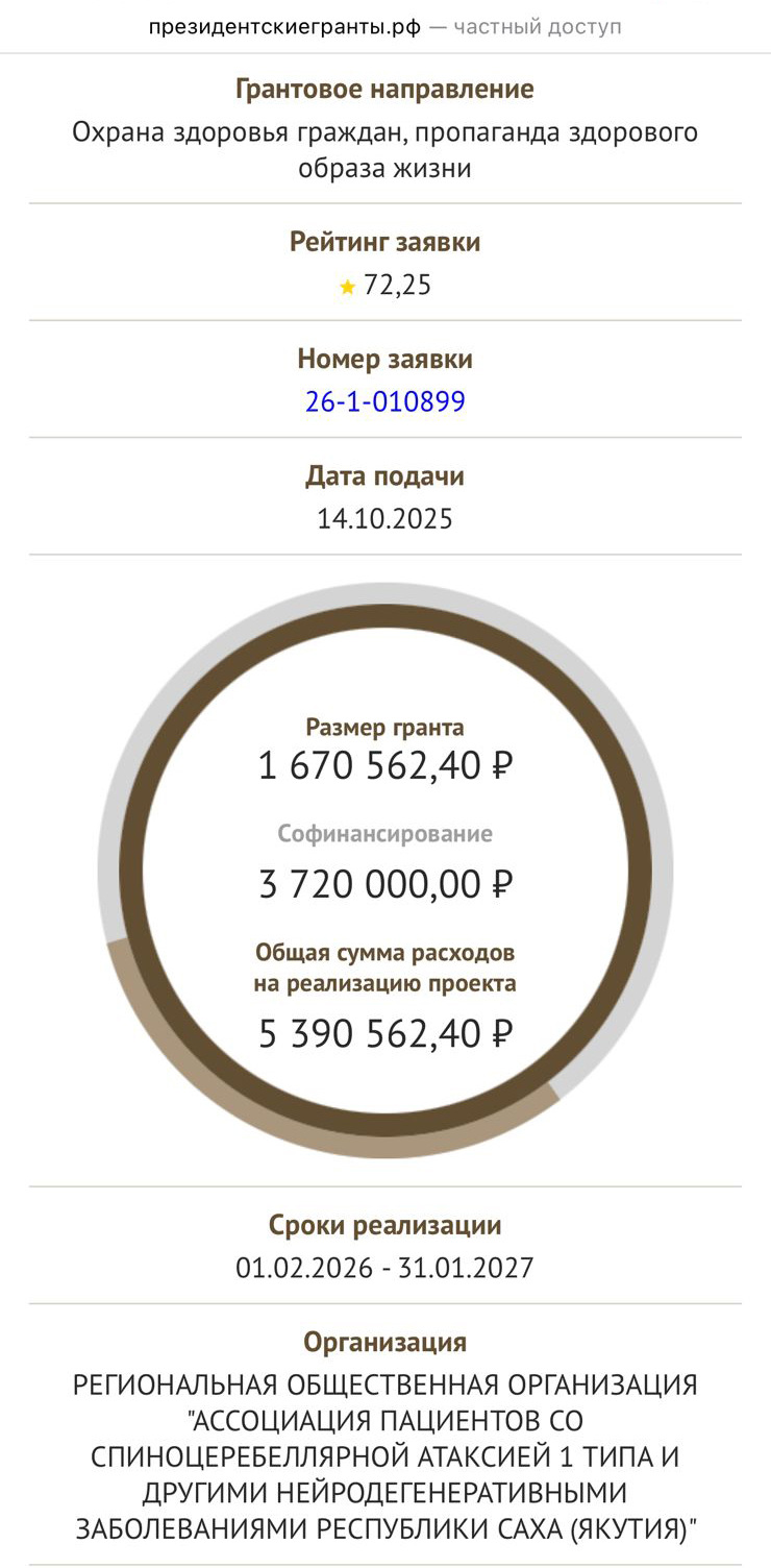 Проект «Наша сила – в единстве. Часть 3», направленный на снижение распространенности наследственных заболеваний среди якутской и смешанной популяции, подготовленный региональной общественной организацией «Ассоциация пациентов со спиноцеребеллярной атаксией 1 типа и другими нейродегенеративными заболеваниями РС(Я)», учрежденный научными сотрудниками ЯНЦ КМП в 2020 году, получил поддержку на первом конкурсе 2026 года Фонда президентских грантов!