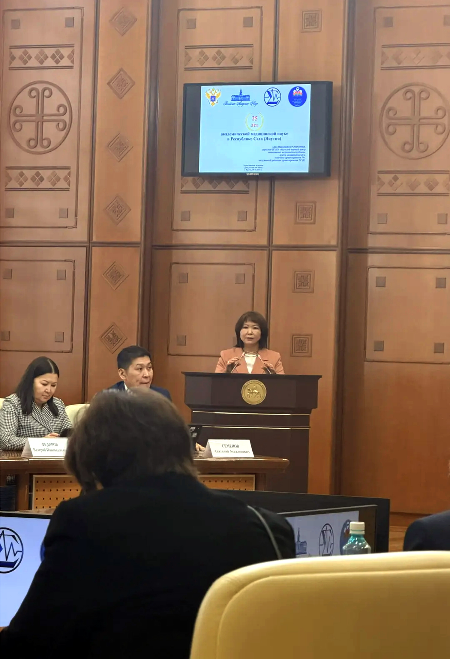 Анна Николаевна Романова, доктор медицинских наук, директор ФГБНУ «Якутский научный центр комплексных медицинских проблем» (ЯНЦ КМП), поделилась достижениями научного центра за 25-летний период. ЯНЦ КМП был создан в 2001 году по инициативе первого Президента Республики Саха (Якутия) Михаила Ефимовича Николаева в соответствии с постановлением Президиума Российской академии медицинских наук от 25 октября 2000 г. № 202 (протокол № 16, § 1) в целях объединения интеллектуальных ресурсов, проведения фундаментальных и прикладных научных исследований, и их координации, эффективного использования научного потенциала региона в интересах развития медицинской науки и здравоохранения, сохранения и улучшения здоровья населения Республики Саха (Якутия). Основателем и первым директором научного центра был доктор медицинских наук, профессор Алкивиад Исидорович Иванов, внесший неоценимый вклад в развитие фундаментальной медицинской науки, медико-генетической и хирургической служб республики. Под его руководством ученые Центра впервые начали изучение генетических основ распространенных заболеваний, было налажено взаимодействие со многими ведущими научными организациями России, ближнего и дальнего зарубежья, с которыми продолжается тесное сотрудничество и налаживаются новые научные связи. ЯНЦ КМП является единственным в Якутии федеральным учреждением академической медицинской науки, ведущим уникальную научно-исследовательскую работу в области изучения функционирования организма человека в экстремальных условиях Севера, изучения здоровья населения Арктики и Субарктики, интегратор генерации новых знаний в области медицины и биологии, разработки и трансфера новых технологий в целях обеспечения технологического суверенитета Российской Федерации. Его приоритетные направления включают изучение механизмов адаптации и патологии в условиях Крайнего Севера, особенностей хронических неинфекционных заболеваний, а также генетико-демографические и молекулярно-генетические исследования. ЯНЦ КМП является базовым центром подготовки высококвалифицированных специалистов в области медицинской науки и практического здравоохранения. За 25 лет ЯНЦ КМП внес весомый вклад в развитие медицинской науки и здравоохранения республики, подготовил плеяду высококвалифицированных научных и медицинских кадров: защищено 14 докторских и 55 кандидатских диссертаций, имеет высокие наукометрические показатели и мировые открытия. Научным центром получены патенты, зарегистрированы программы ЭВМ и базы данных, результаты которых внедряются в практическое здравоохранение. Ведется разработка диагностического медицинского изделия, которое будет способствовать снижению смертности женщин от рака шейки матки, позволит решить задачи технологического суверенитета страны. С 2018 года биоресурсная коллекция ДНК популяций Якутии, большая часть образцов набирается в ходе экспедиционных выездов в районы республики. Активно развивается международное сотрудничество с казахстанскими коллегами в области изучения нейрогенетического профиля пациентов со сложными нейродегенеративными заболеваниями. Ежегодно научные сотрудники, врачи-неврологи ЯНЦ КМП участвуют с докладами на международной конференции «Междисциплинарная неврология» в г. Шымкенте. Клини