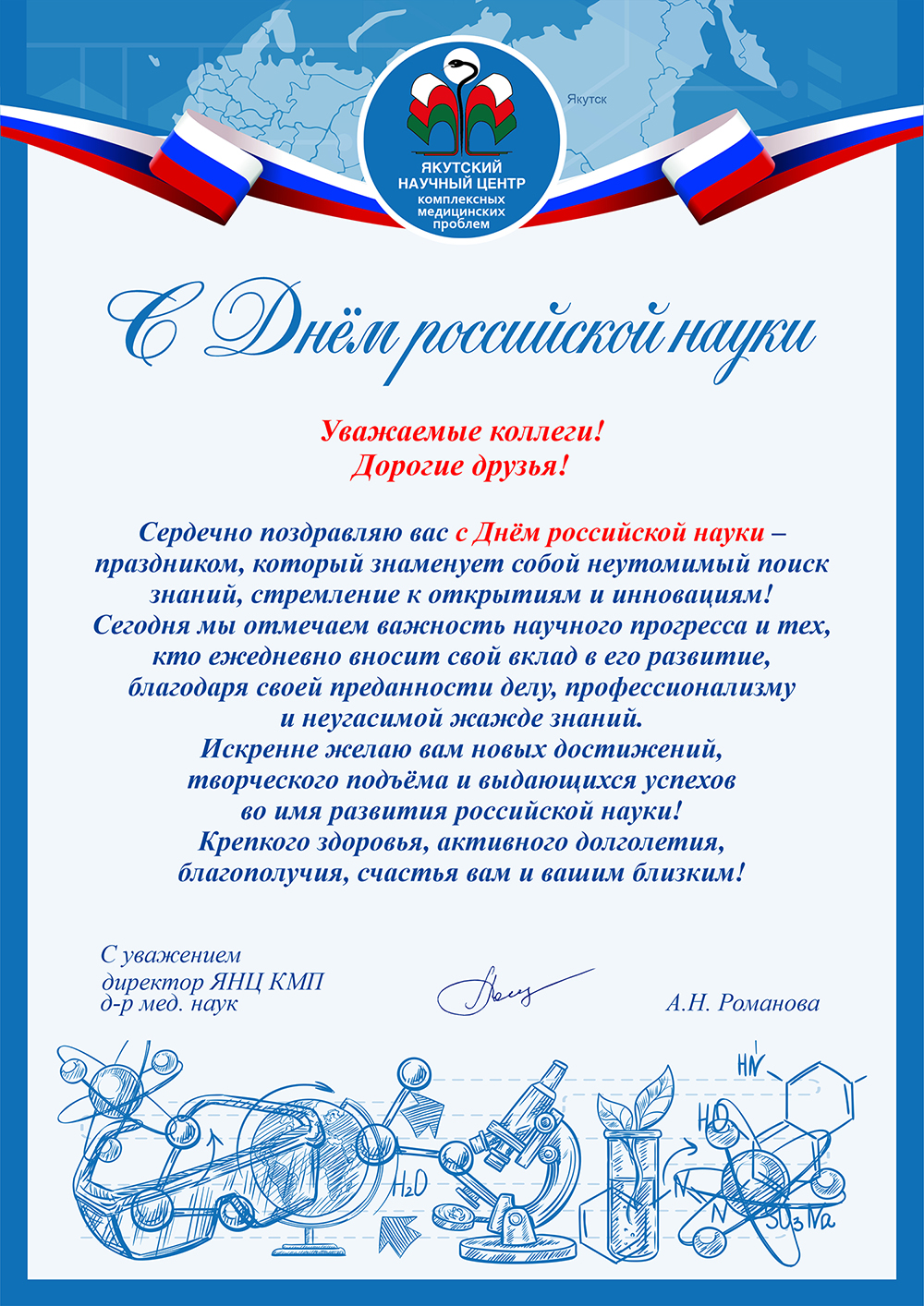 Уважаемые коллеги! С днем российской науки! Новых творческих и профессиональных успехов, реализации поставленных целей и задач! Благополучия и процветания!