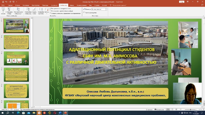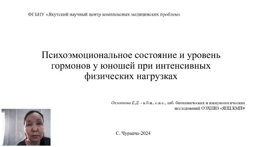 Охлопкова Елена Дмитриевна, к.б.н., старший научный сотрудник, выступила с темой «Психоэмоциональное состояние и уровень гормонов у юношей при интенсивных физических нагрузках» и награждена дипломом I степени за лучший доклад в данной секции, Константинова Лена Ивановна, к.б.н., научный сотрудник, выступила с темой «Оценка устойчивости организма спортсменов Якутии к гипоксии» и Олесова Любовь Дыгыновна, к.б.н., ведущий научный сотрудник, – с темой «Адаптационный потенциал студентов СВФУ им. М.К. Аммосова с различной двигательной активностью».